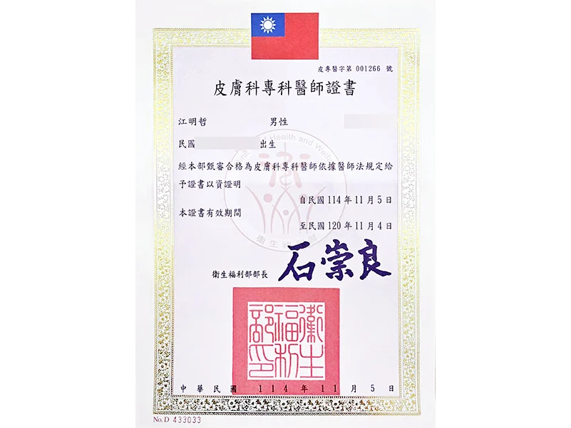皮膚專科證書 江明哲醫師